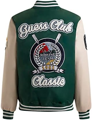 Make moves in this varsity jacket. Featuring a color-block design, embroidered varsity-style patches at the front and back, ribbed trim with classic stripes and button closures.